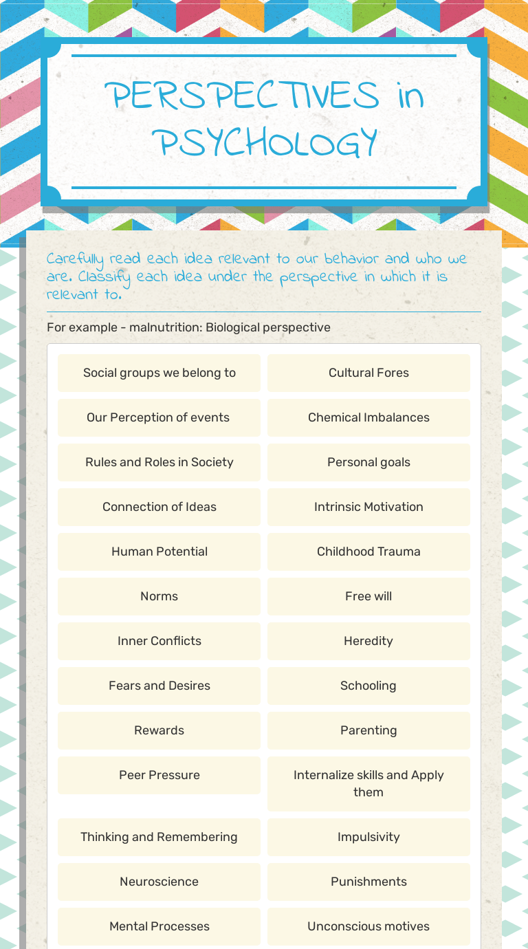 At this point in modern psychology, the varying viewpoints on human behavior have been split into eight different perspectives: Perspectives practice questions name lilian below are a set of scenarios and ideas that a psychologist from a particular perspective might use. This is a classroom activity on the major perspectives in ap psychology including biological. As you read, relate this information to the case study in the previous handout. Psychologists of the psychodynamic approach believe . An approach to psychology centered on the evolutionary ideas such as adaptation, reproduction, and . Choose the best perspective of the following: In the evolutionary perspective of psychology, behaviour is adaptive,hereditary, and cultural due to the way we have evolved and natural selection. This worksheet helps clients to identify their automatic interpretation of a situation and then prompts them to think about that situation in a variety of ways. The defining principles and concepts of the behaviourist perspective (classical conditioning). This worksheet outlines the principles of classical . Manipulation of information may cause cognitive distortions. These errors in thinking produce .